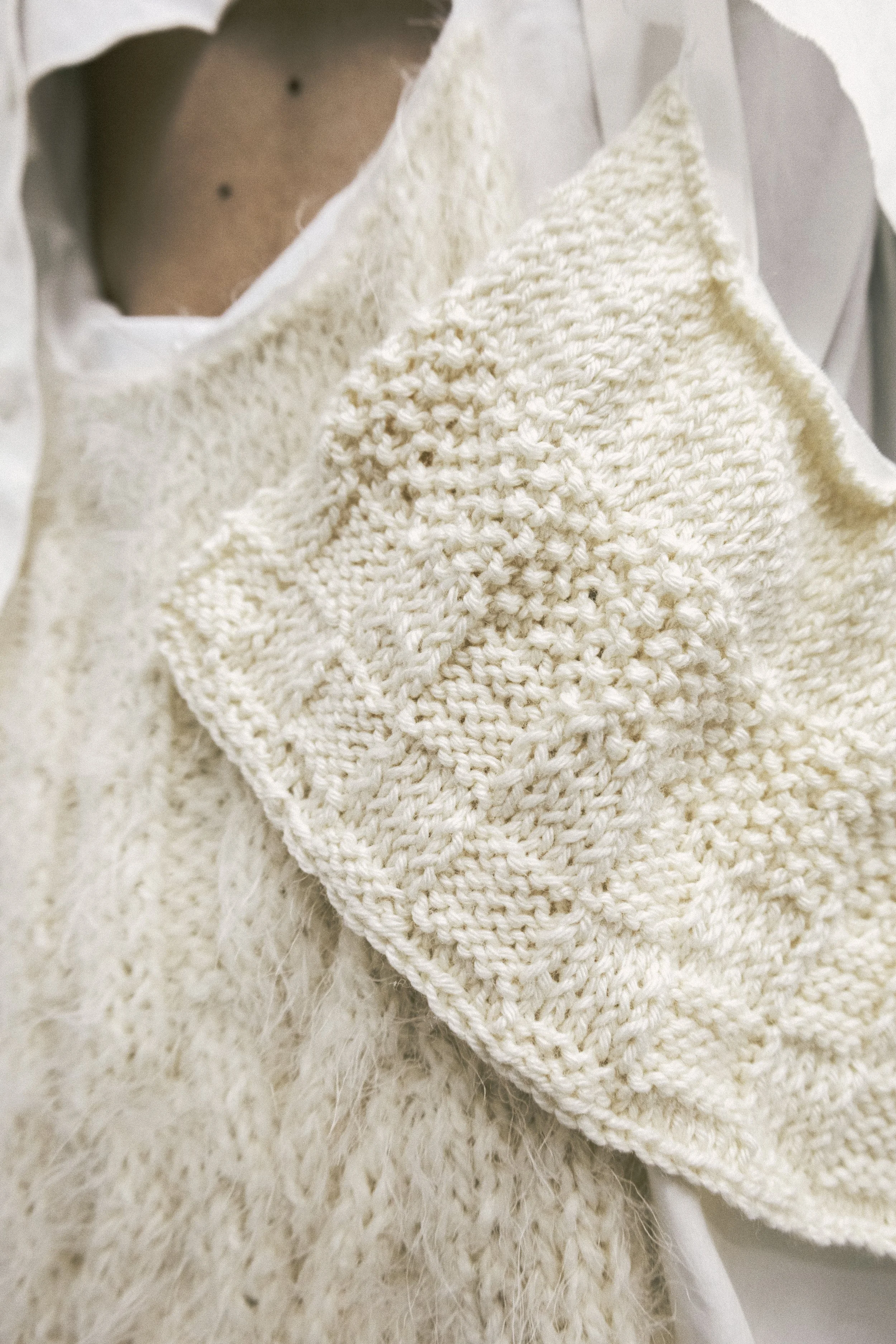 The 2-day performance is with the performer (me) sitting and knitting on broken clothes for 6 hours each day, slowly growing from the garments’ “wounds.” In 12 hours, the garments started to have extensions of knits from the broken parts, like a tree's roots growing, representing the rebirth human beings can have from the broken parts of ourselves.